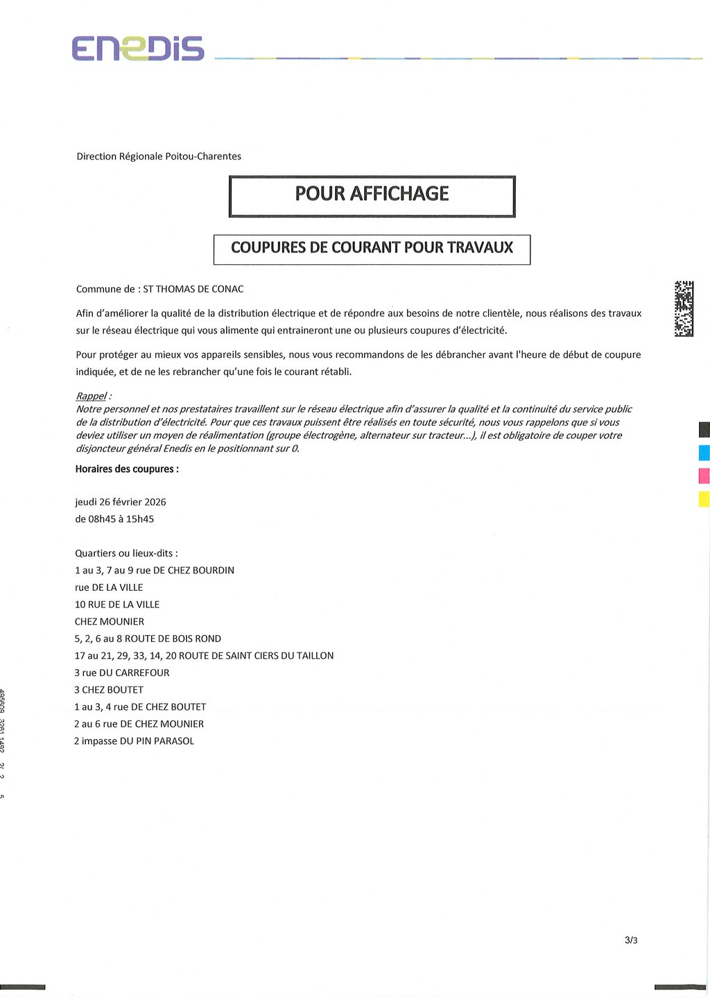 Coupures de courant pour travaux jeudi 26 février de 8 h 45 à 15 h 45
