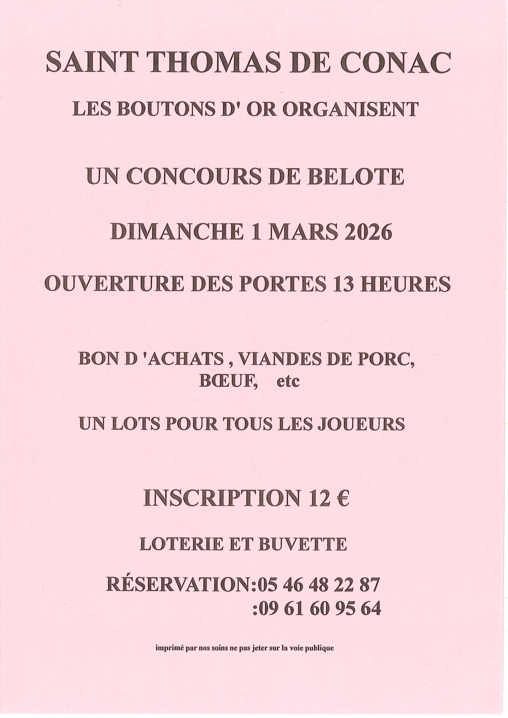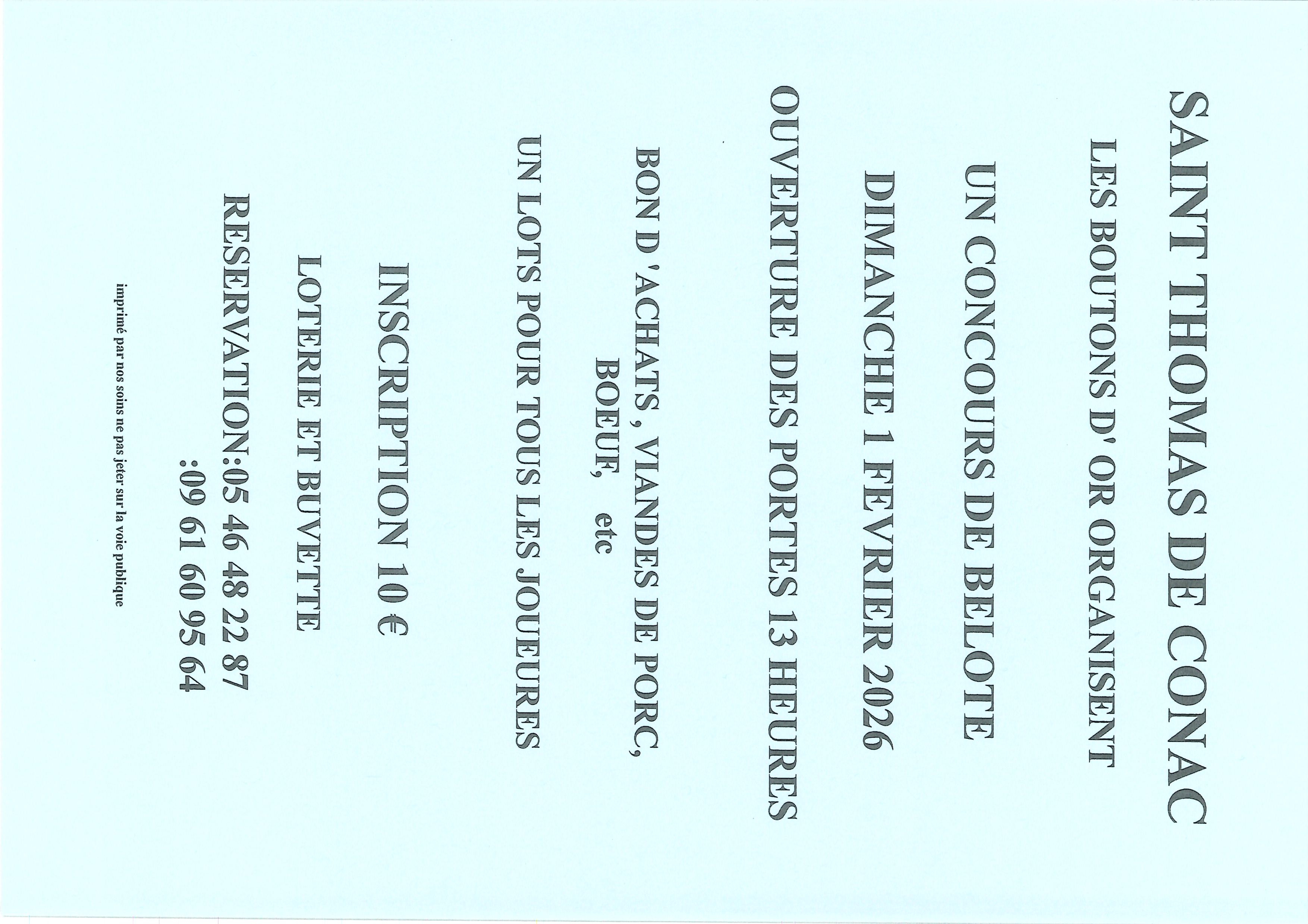 L'association Les Boutons d'Or organise un concours de belote le dimanche 1er mars à la salle des fêtes de St Thomas de Conac.