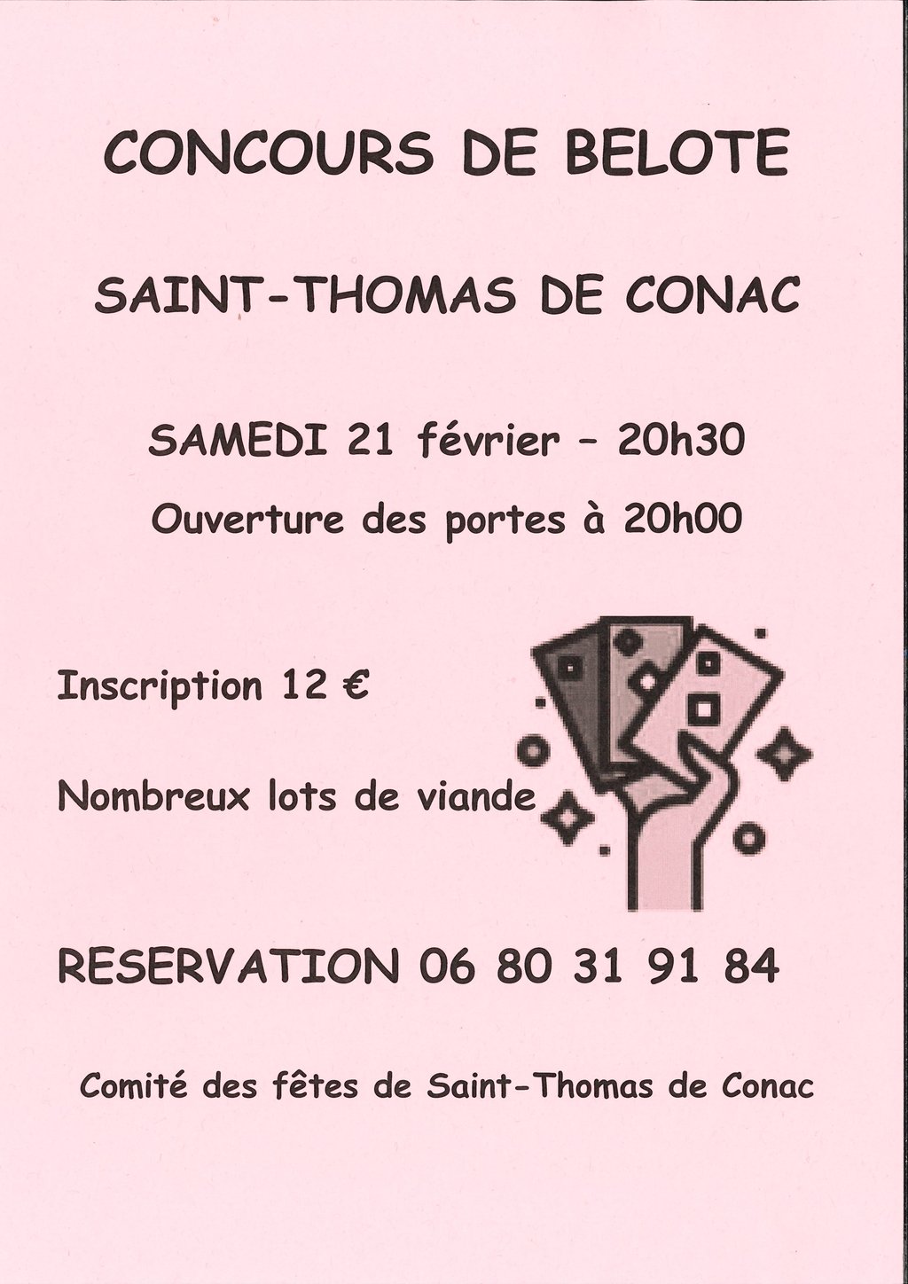 Le comité des fêtes de St Thomas de Conac organise un concours de belote samedi 21 février à la salle des fêtes.