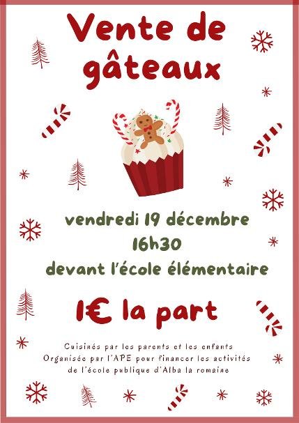 Une vente de gâteaux aura lieu ce vendredi 19 décembre à 16h30 devant l'école élémentaire.