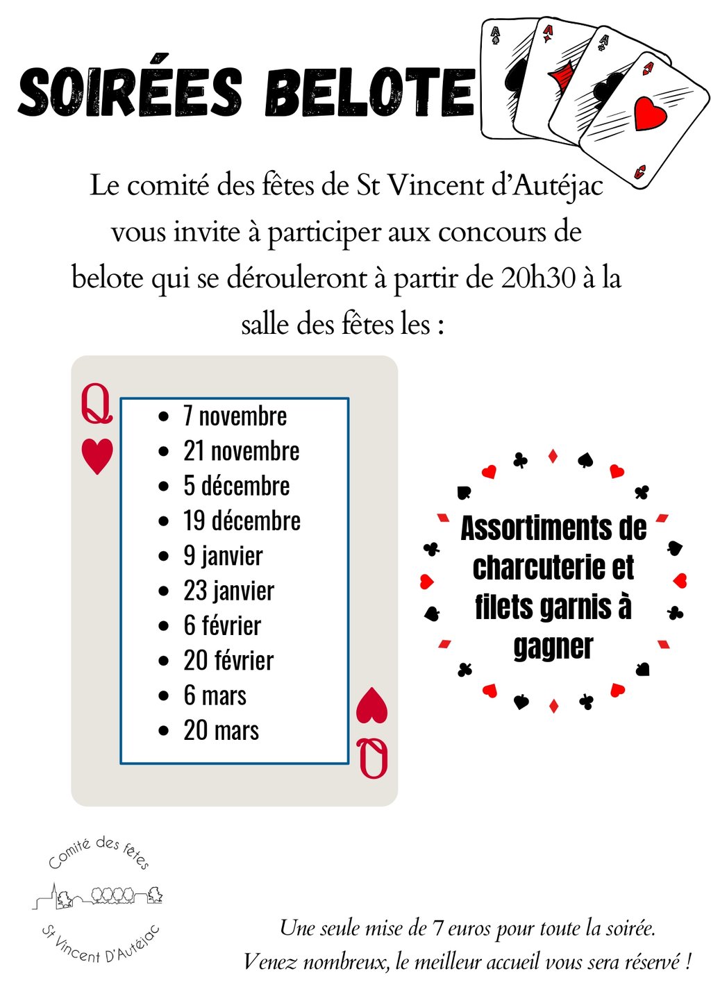 Le comité des fêtes de St Vincent d’Autéjac vous invite à participer aux concours de belote qui se dérouleront à partir de 20h30 à la salle des fêtes les :
