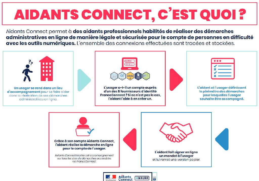 À l’inverse d’un conseiller numérique, Aidants Connect est un service public qui vise à sécuriser l’intervention d’un aidant professionnel pour le compte d’un usager. Autrement dit, Aidants Connect a pour but d’effectuer une démarche administrative en ligne à la place d’un usager et en sa présence. Par le biais d’un logiciel spécifique et d’une double authentification, ce dispositif permet ainsi à l’aidant d’agir tout en protégeant les données personnelles de l’usager (mot de passe, informations sensibles…). Concrètement, cette aide se formalise par la création d’un mandat temporaire entre l’aidant et l’usager qui détermine la liste des formalités administratives à réaliser. Les usagers peuvent ainsi obtenir un accompagnement personnalisé, gratuit et sécurisé.