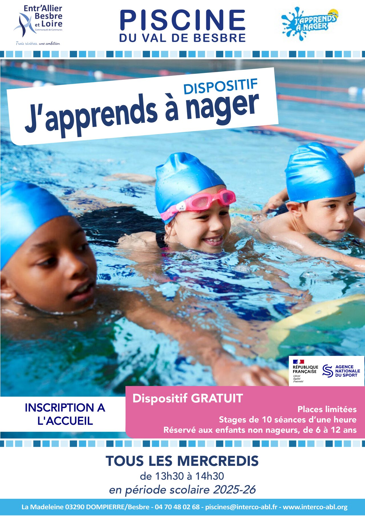 🏊‍♂️ Il reste encore quelques places pour le dispositif « J’apprends à nager », organisé du 19 mars au 21 mai, les mercredis de 13h30 à 14h30, à la piscine communautaire de Dompierre/Besbre.