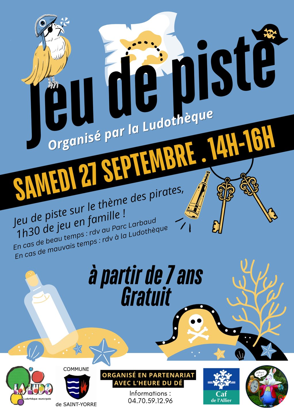 Ce samedi 27 septembre de 14h à 16h, partez en famille à l’aventure avec un grand jeu de piste sur le thème des pirates. Une heure et demie de défis, d’énigmes et de trésors cachés vous attendent.