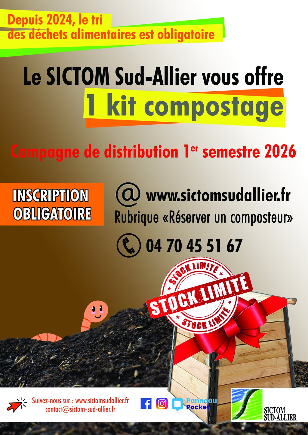 Le SICTOM Sud-Allier informe des dates et lieux de distribution des kits compostage gratuits pour le premier semestre 2026.