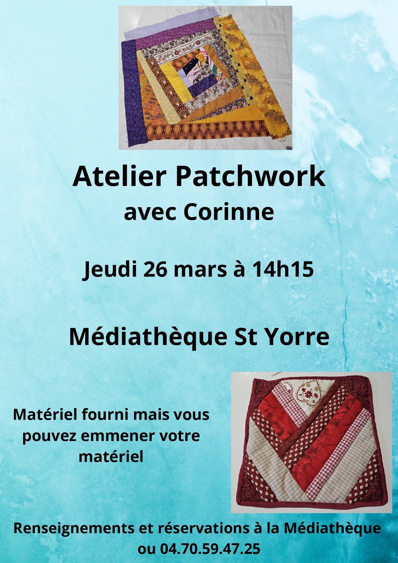 Pour apprendre ou pour se perfectionner avec le Patchwork, Corinne nous fait découvrir sa passion et tout se fait à la main sans machine JEUDI 26 MARS à 14h15