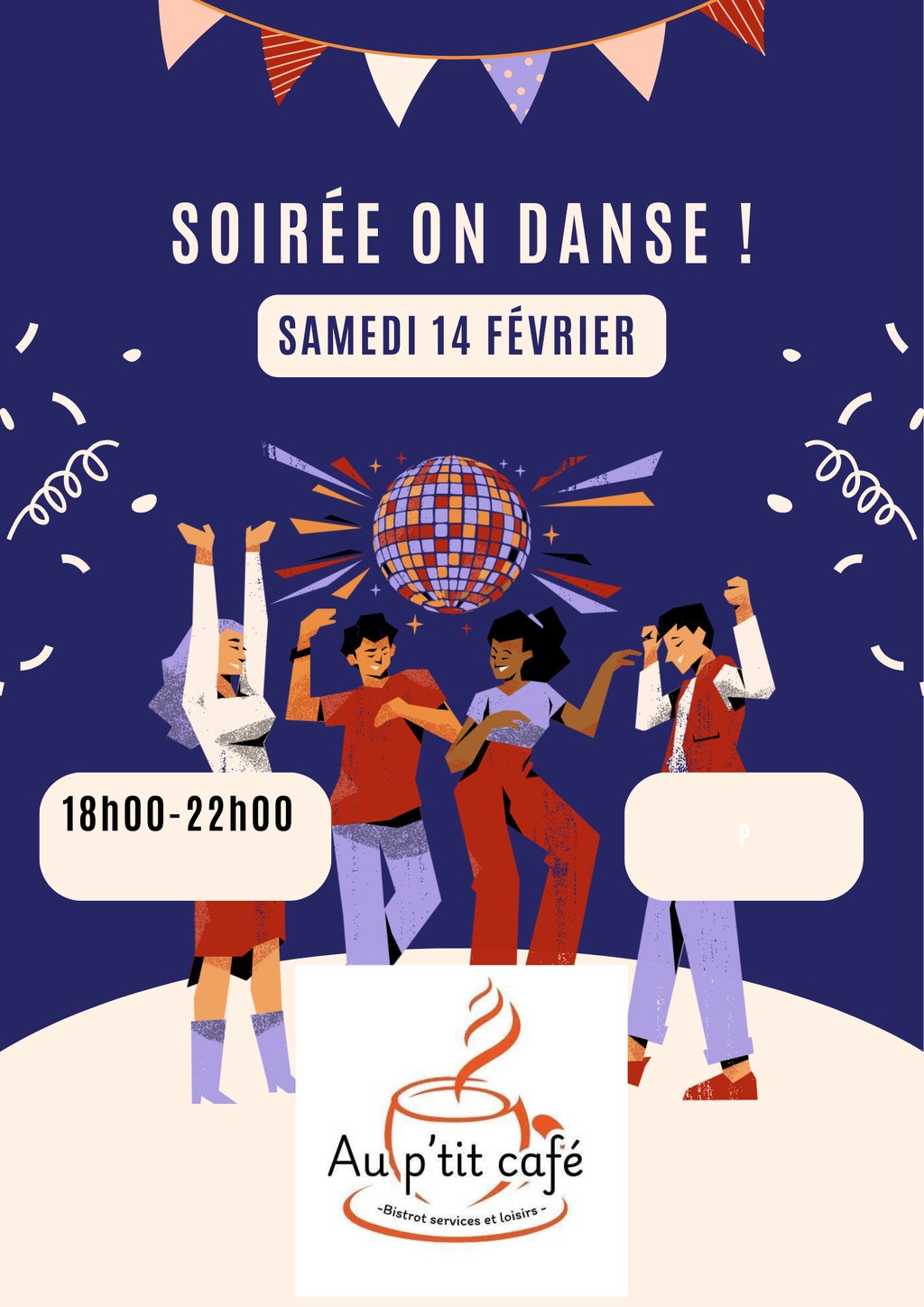 - Le samedi 14 février, je vous propose une soirée musique/danse : envoyez-moi vos titres préférés et on les passera pour danser au café. Une possibilité pour se restaurer est encore à confirmer.