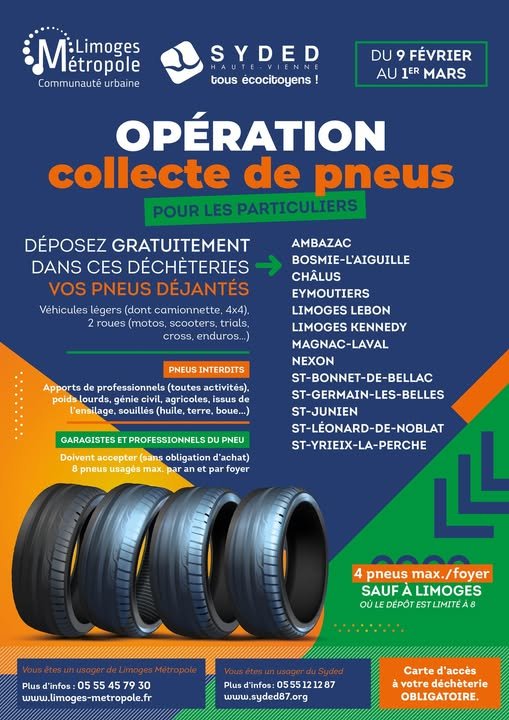 En dehors de cette opération ponctuelle organisée une fois par an par Limoges Métropole et le SYDED Haute-Vienne, les garagistes et professionnels du pneu ont l’obligation légale de reprendre gratuitement vos pneus usagés (sans obligation), dans la limite de 8 unités par an et par foyer. Plus d’informations sur quefairedemesvieuxpneus.fr