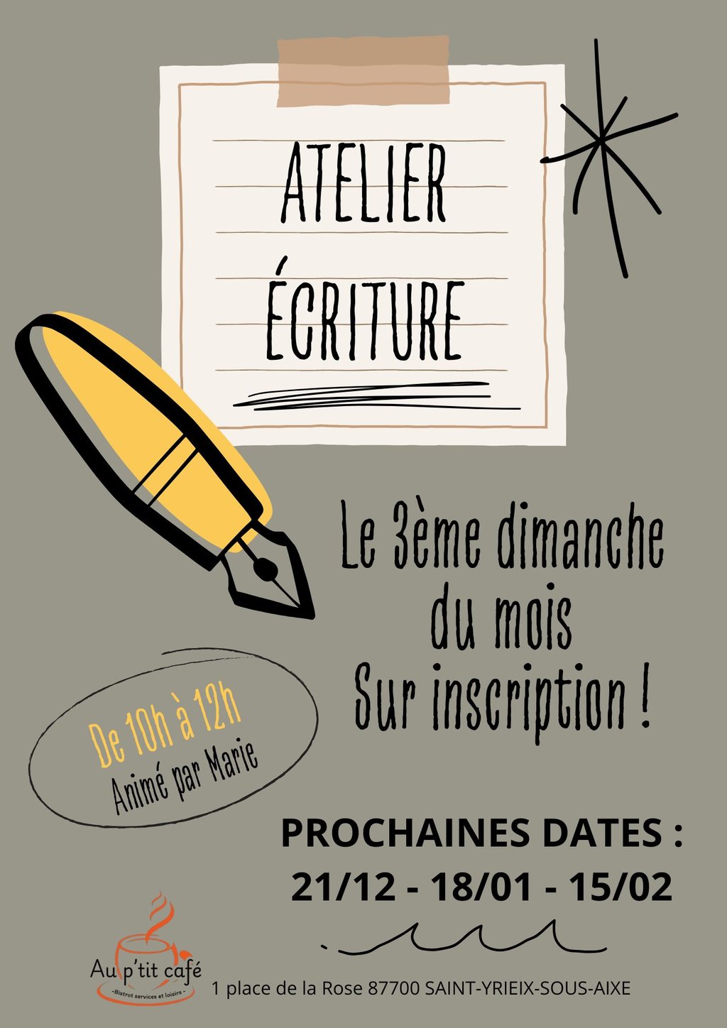 Atelier d'écriture le 3ème dimanche du mois de 10h à 12h
