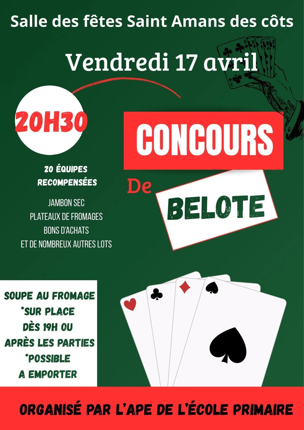 Vendredi 17 avril, l'APE de l'école primaire de Saint-Amans-des-Côts organise un concours de belote à 20h30 à la salle des fêtes. Soupe au fromage dès 19h et après les parties (+ possibilité à emporter).