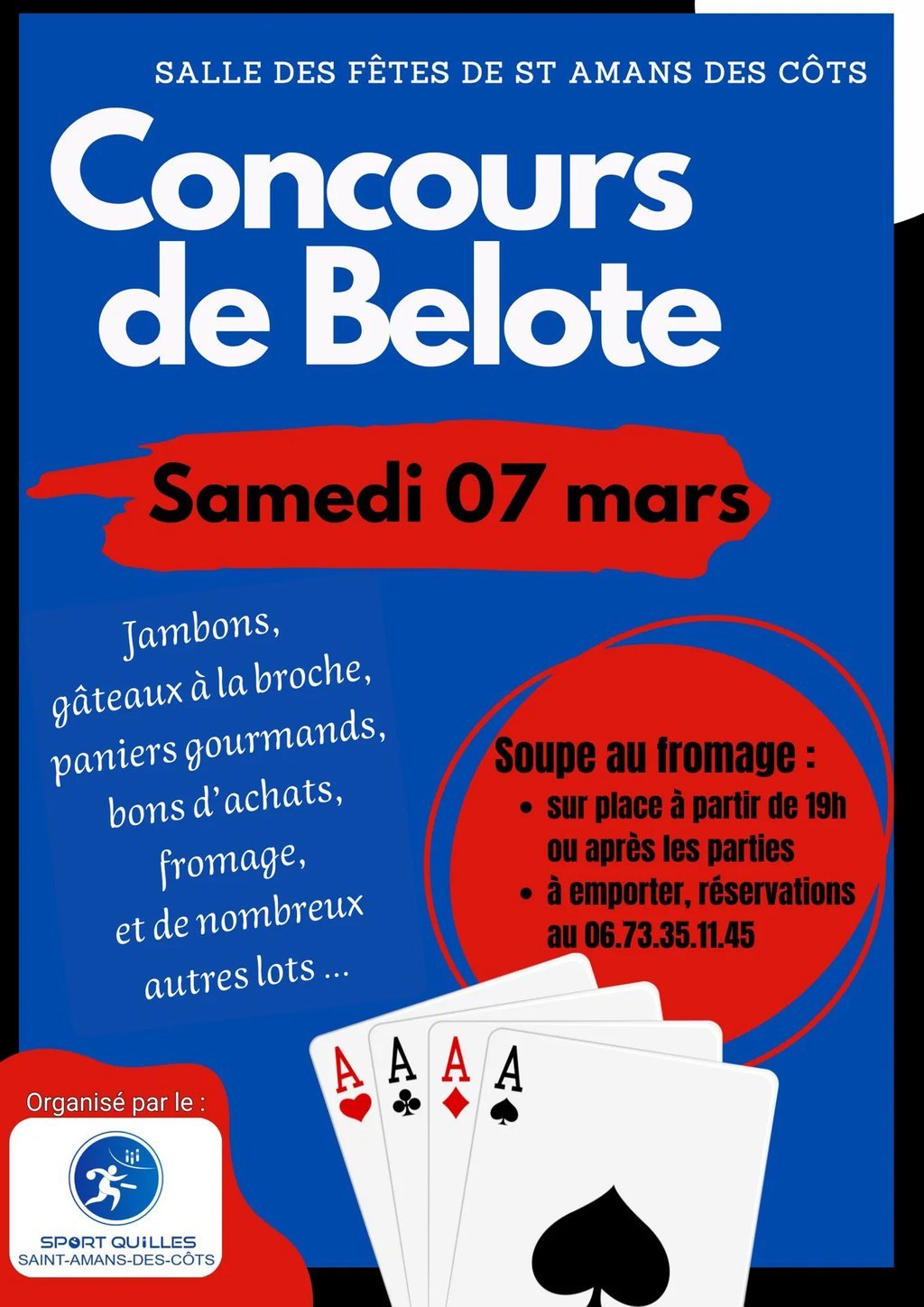 Samedi 7 mars concours de belote des quilles à 20h30 à la salle des fêtes de Saint-Amans-des-Côts. Soupe au fromage à consommer sur place à partir de 19h et après le concours ou à emporter (réservation au 06.73.35.11.45).
