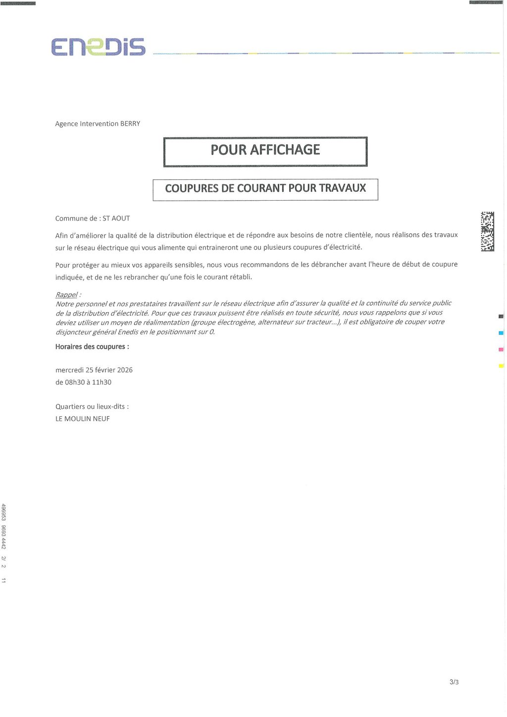 Nous vous informons qu’une coupure de courant est prévue par Enedis afin de permettre des travaux sur le réseau électrique.