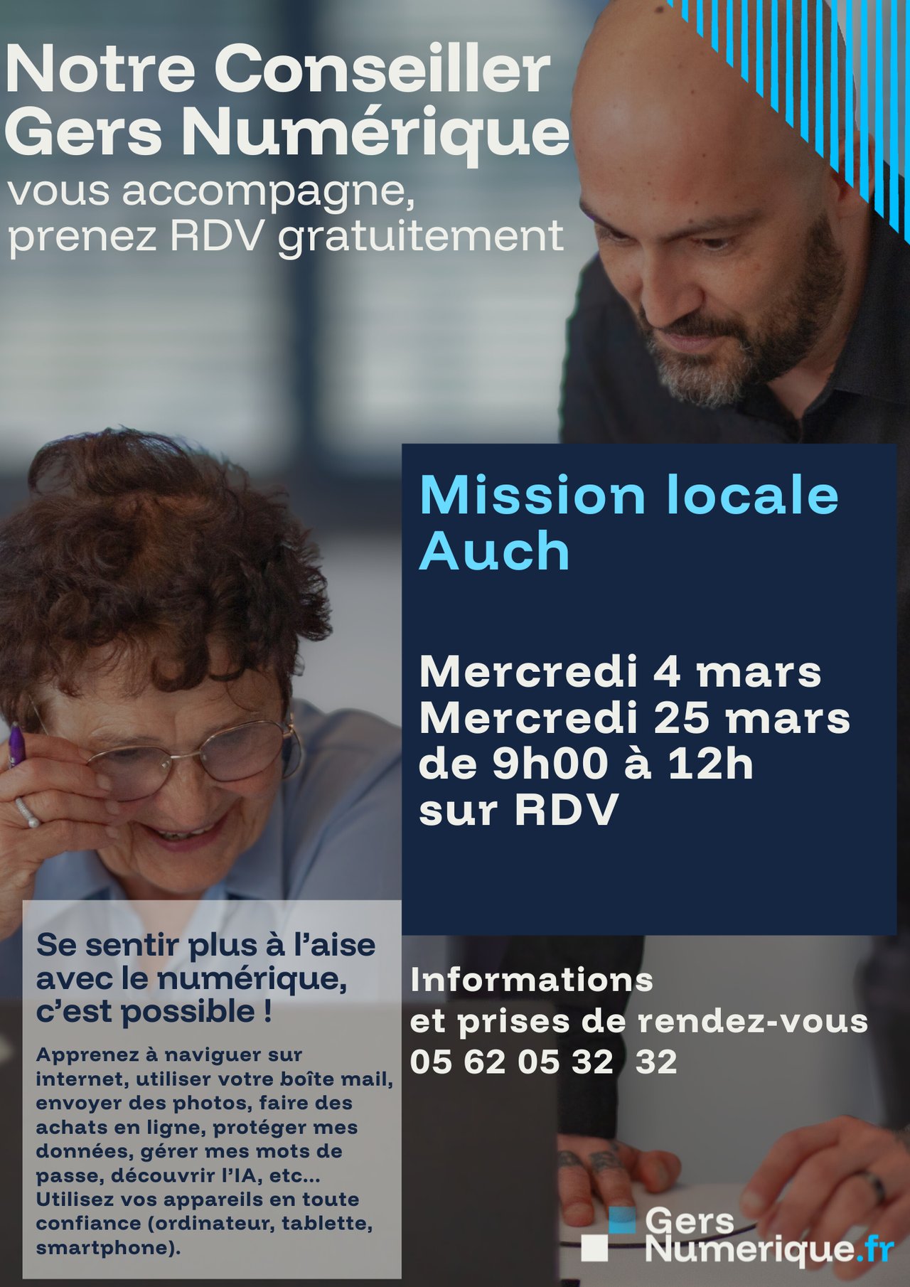 📍 Le conseiller Gers Numérique se déplace au plus près de chez vous pour vous accompagner gratuitement et individuellement sous forme d'atelier.