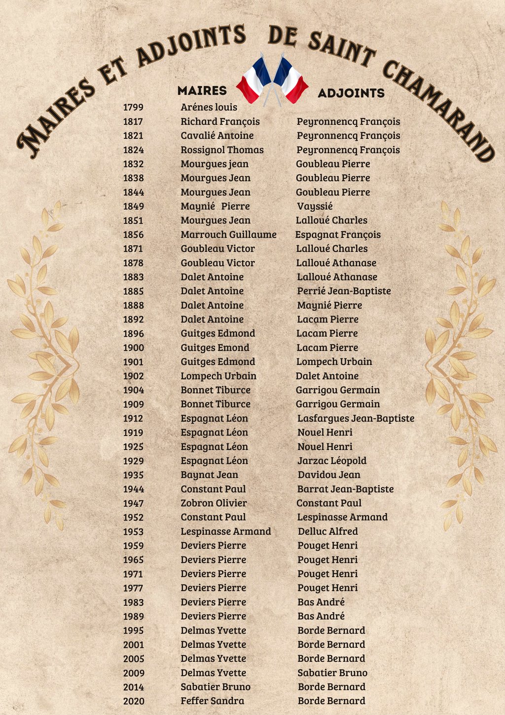 L'équipe municipale de Saint-Chamarand a le plaisir d'annoncer la reconstitution de la liste des maires qui ont façonné l'histoire de notre commune depuis la Révolution française.