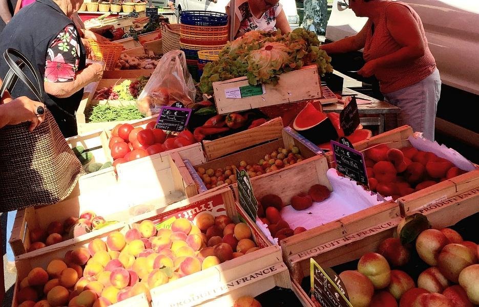 Petit marché avec la présence de divers stands : légumes et fruits, pains, fromages, poissons...