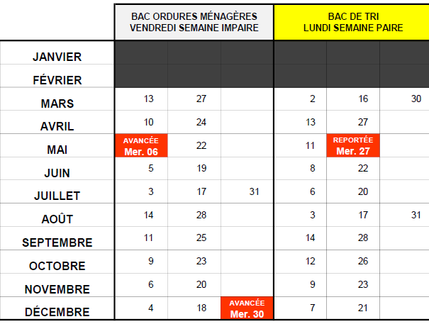 CALENDRIER COLLECTE BAC DE TRI ET BAC DES ORDURES MÉNAGÈRES