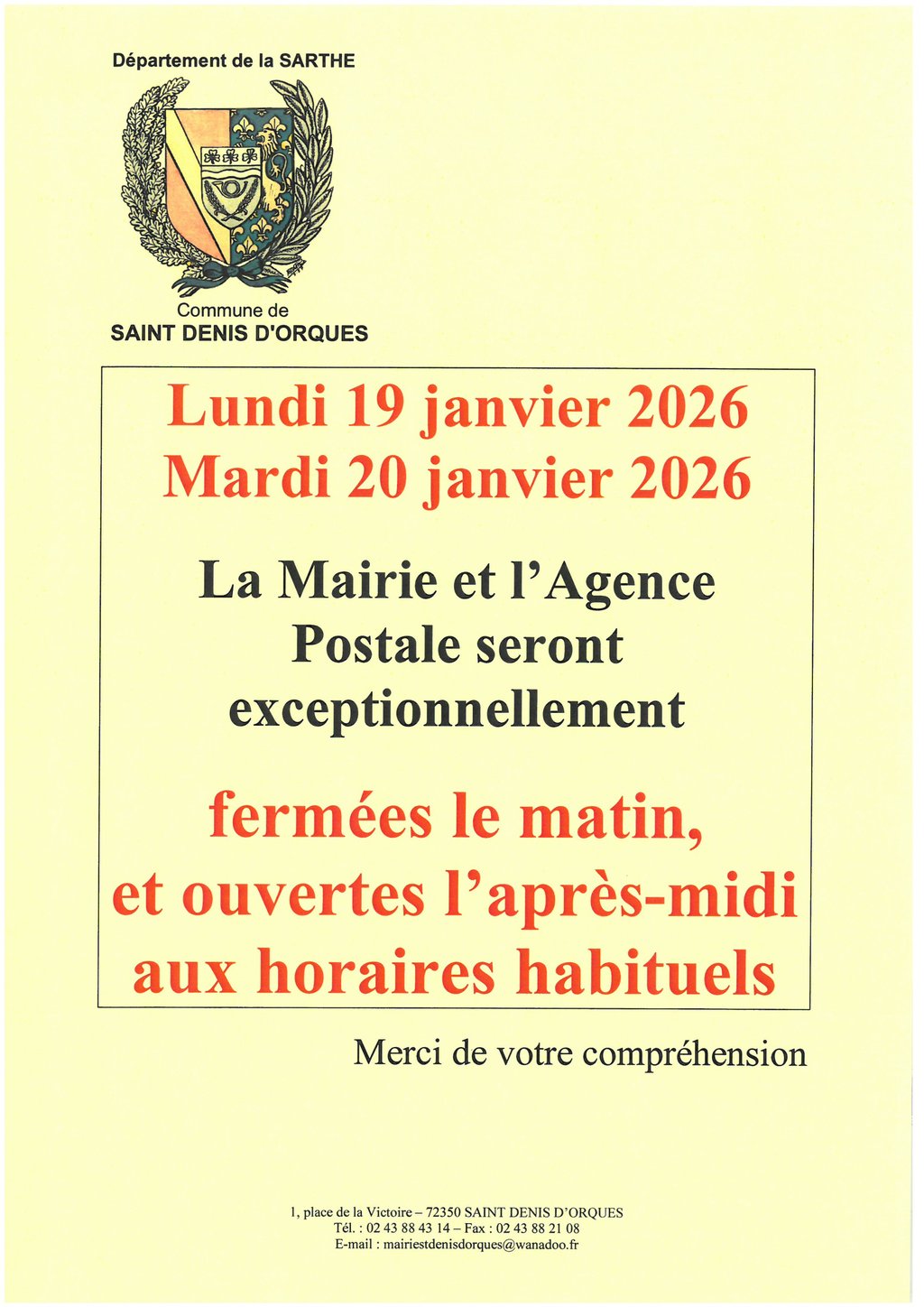 Fermeture Agence Postale-Mairie le lundi 19 janvier 2026 le matin : ouverture de 14h à 18h