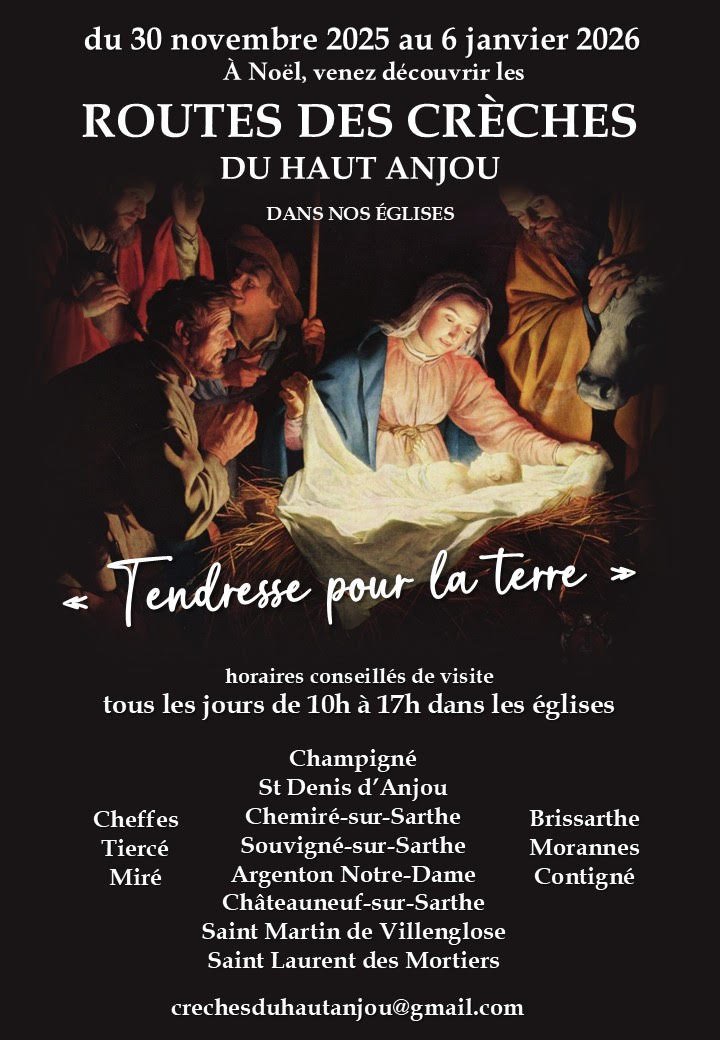 Églises ouvertes : Cheffes, Tiercé, Miré, Champigné, Saint-Denis-d’Anjou, Chemiré-sur-Sarthe, Souvigné-sur-Sarthe, Argenton-Notre-Dame, Chateauneuf-sur-Sarthe, Saint-Martin-de-Villenglose, Saint-Laurent-des-Mortiers, Brissarthe, Morannes et Contigné.