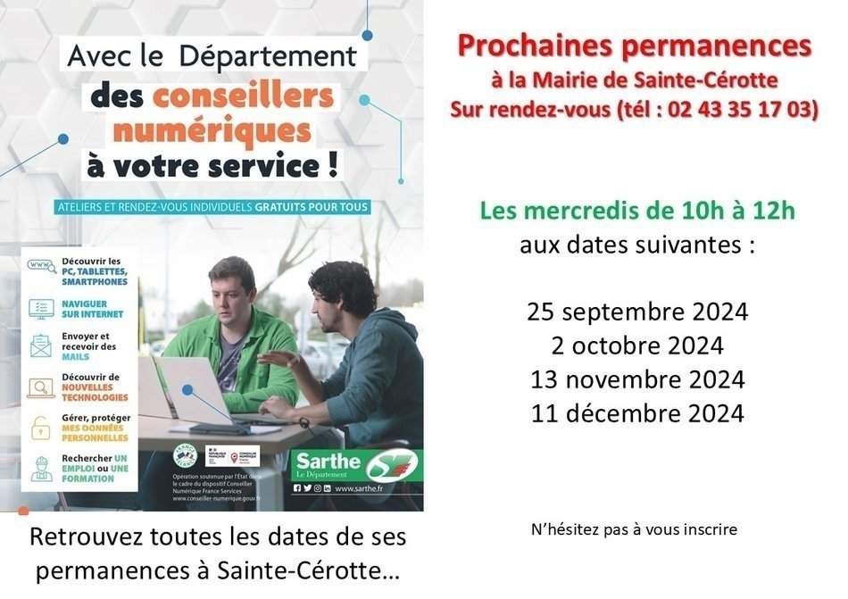 permanence du conseiller numérique à la Mairie de Sainte-Cérotte. Sur rendez-vous en appelant la mairie au 02.43.35.17.03
