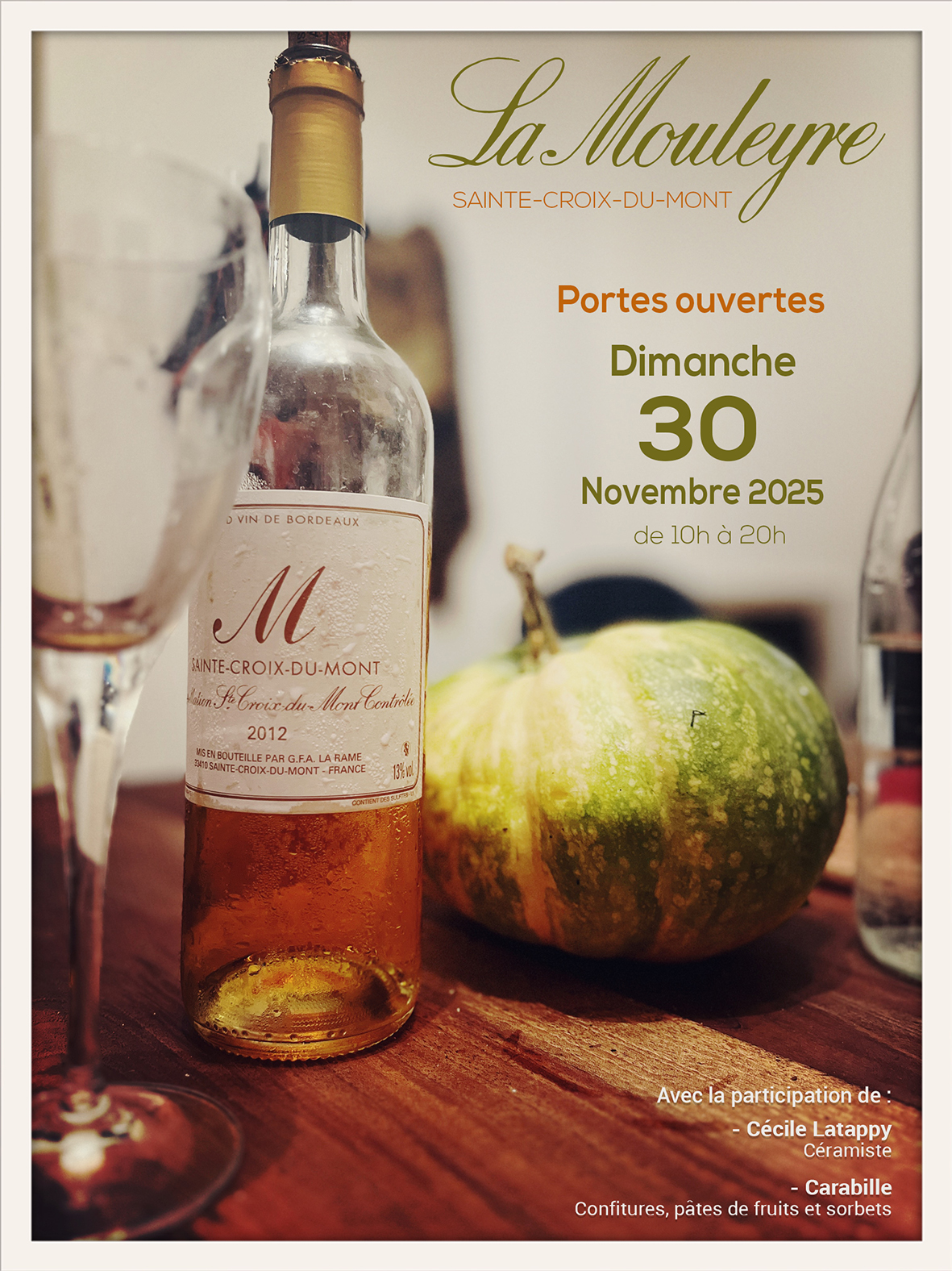 Nous sommes heureux de vous inviter à la journée Portes ouvertes le dimanche 30 novembre 2025, de 10 h à 20 h à La Mouleyre à Sainte-Croix-du-Mont.