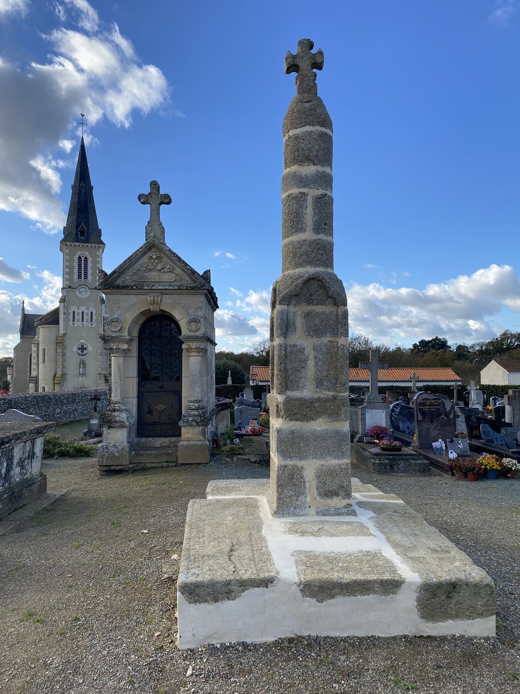 Haute de quatre mètres, la croix hosannière est un édicule funéraire situé au milieu du cimetière.