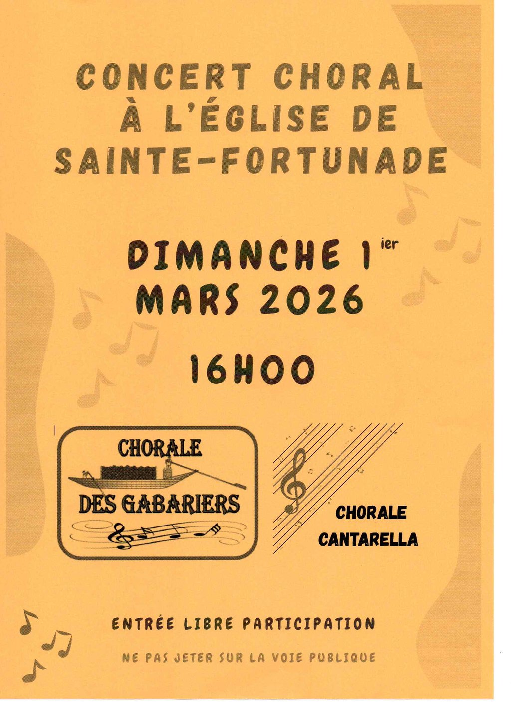 La chorale Cantarella et la chorale des Gabariers d'Argentat vous invitent à un concert dans l'église de Sainte-Fortunade le dimanche 1er mars.
