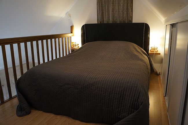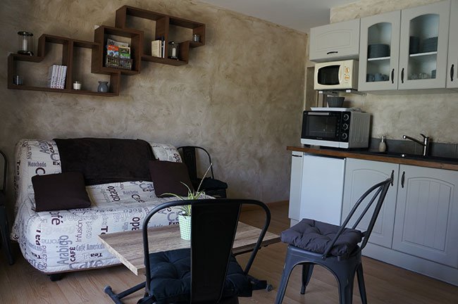 Rez de chaussée : séjour avec coin cuisine (canapé convertible BZ 2 personnes, table à manger ou de salon modulable), salle d'eau avec wc. Etage : chambre en mezzanine (1 lit 2 personnes 160 x 200 cm). Chauffage électrique inclus. Terrasse. Jardin commun de 6500 m² (dont herbage clos de 3300 m²) avec des chèvres et des poules.