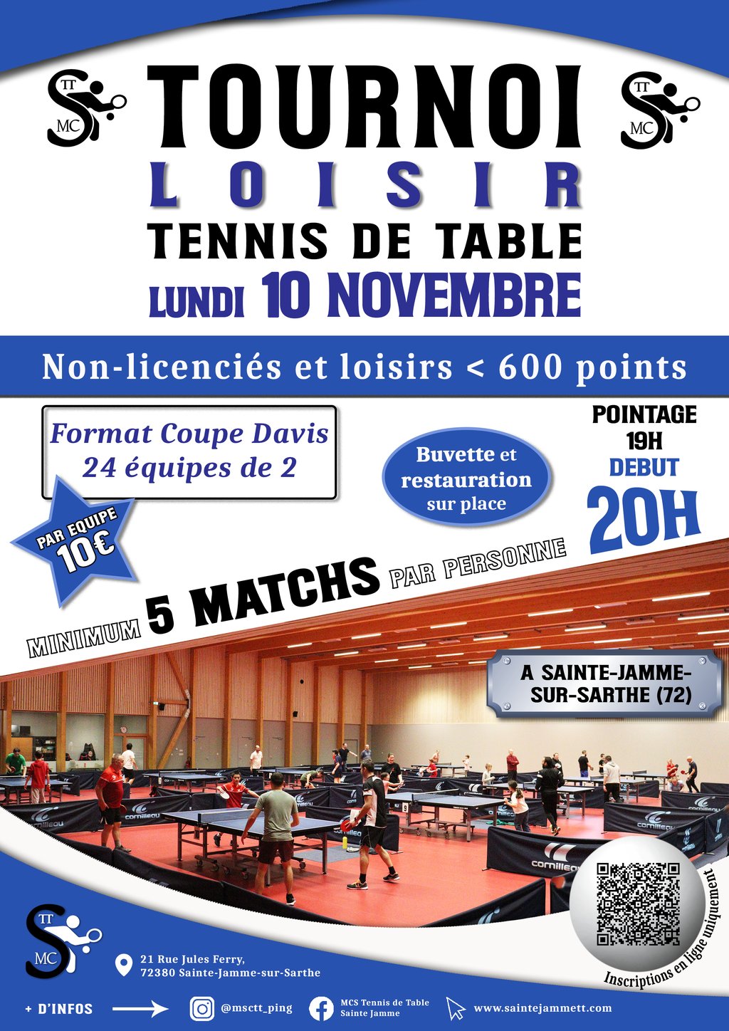 Tournoi de tennis de table par équipe de 2 joueurs réservé au public non licencié ou licencié loisir.