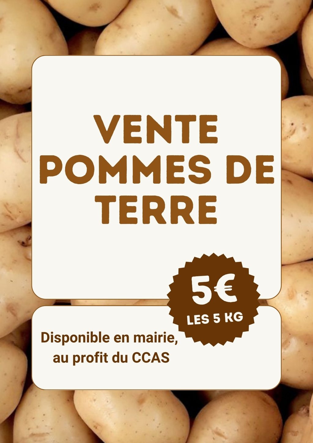 Vente de pommes de terre au profit du CCAS, il reste des filets de 5 kilos Ă 5âŹ, vous pouvez venir en acheter en mairie, aux heures d'ouvertures.
