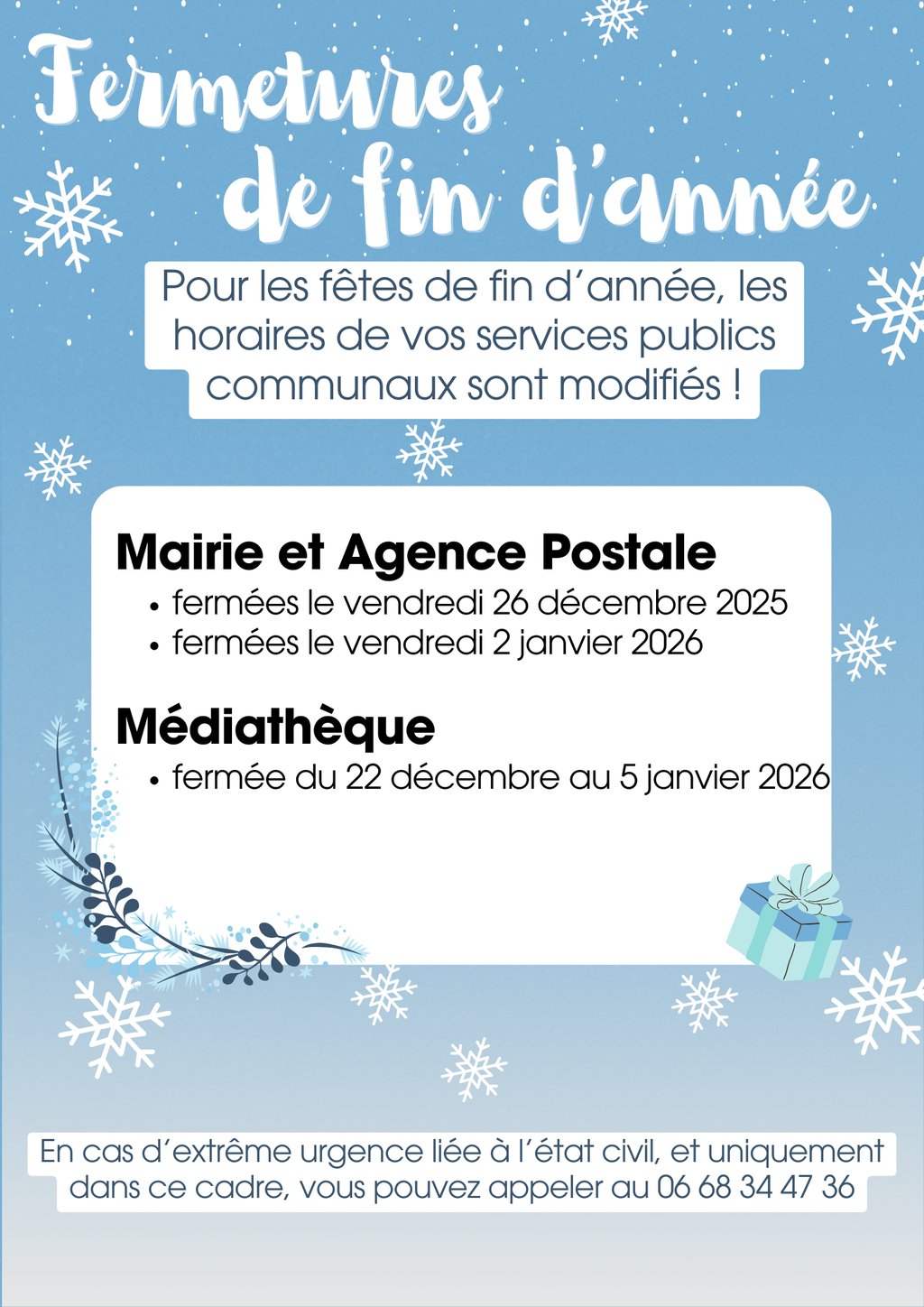 - La Mairie et l'Agence Postale sont fermées, les vendredis 26 décembre 2025 et 6 janvier 2026.