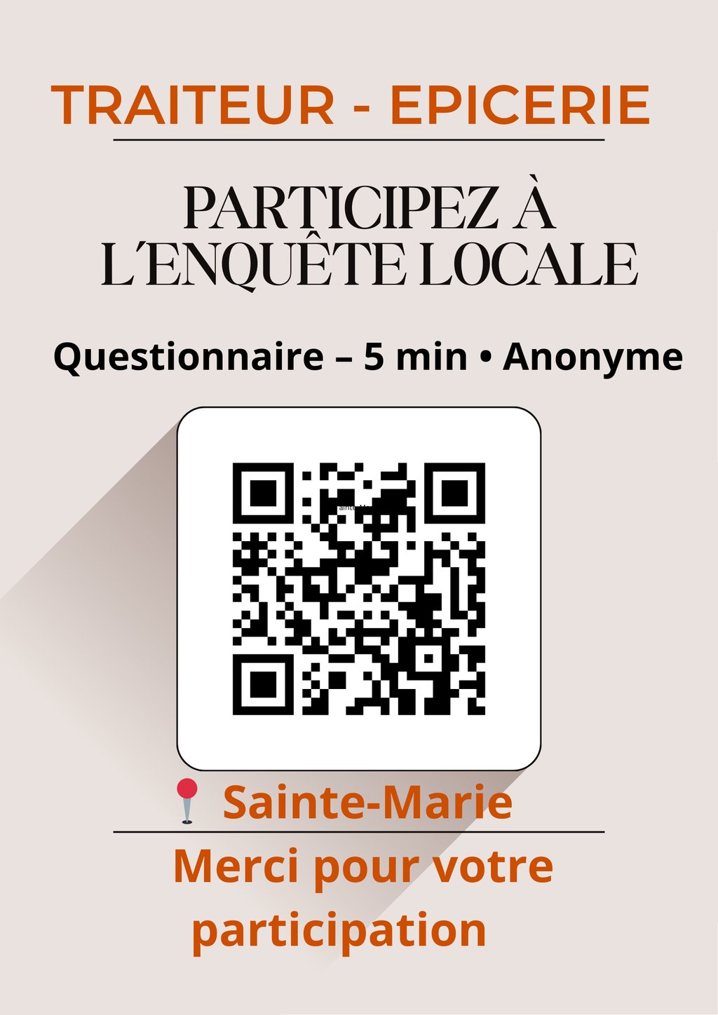 Dans le cadre d’une étude de marché pour un projet de traiteur-épicerie, un questionnaire anonyme (5 min) est à votre disposition.