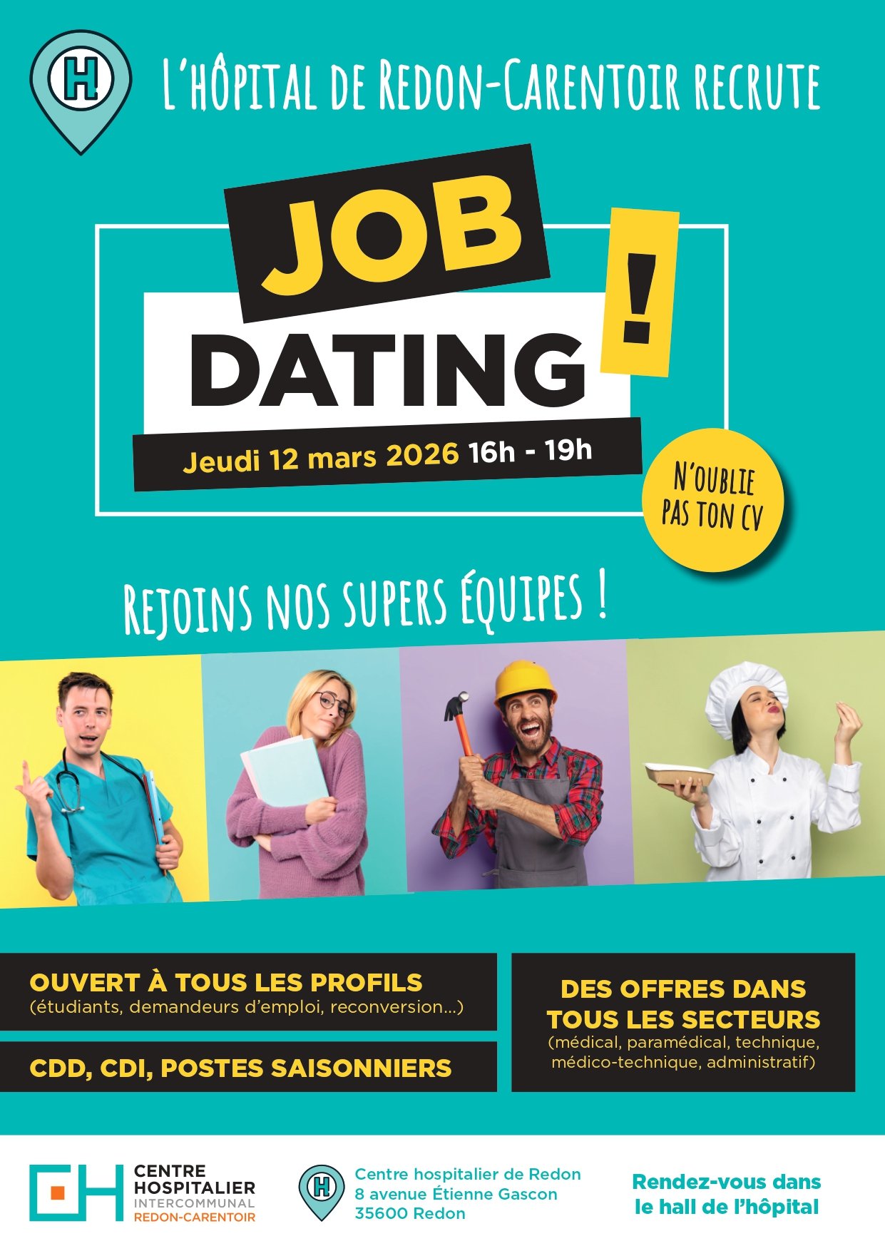 Le Centre Hospitalier de Redon-Carentoir organise un Job Dating le jeudi 12 mars 2026 de 16h à 19h, sur le site de Redon.