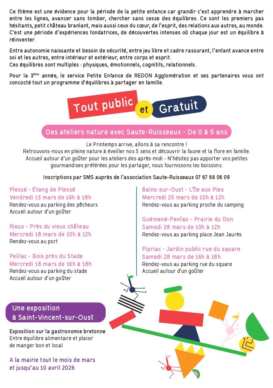Le service Petite-Enfance de REDON Agglomération et ses partenaires se sont associés pour vous offrir un programme d'équilibres à partager en famille.