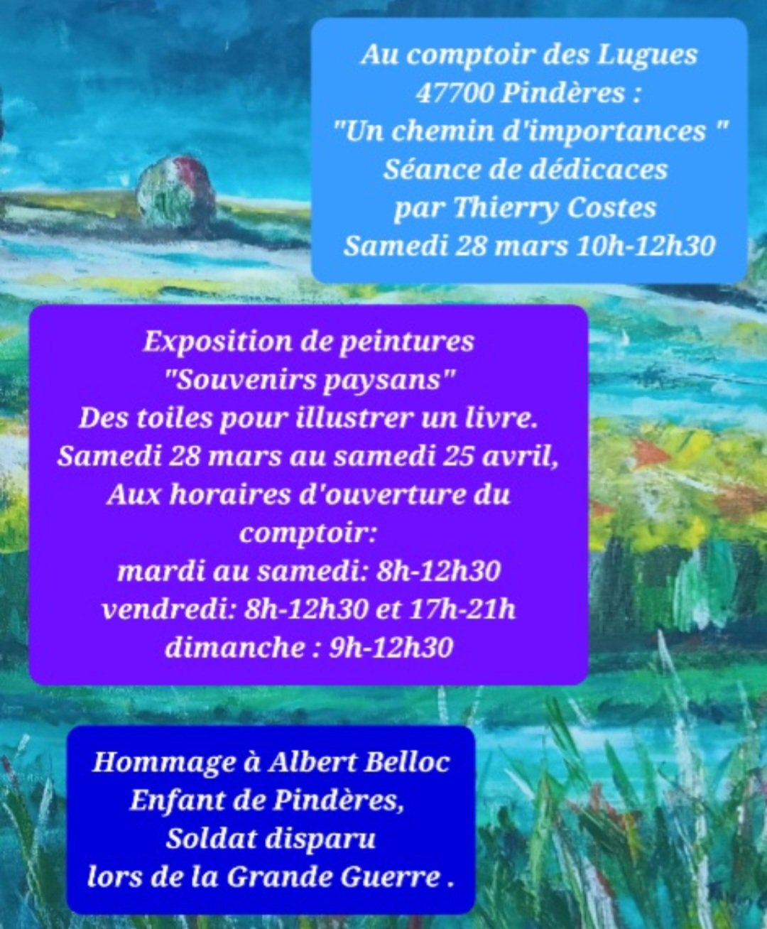 Thierry Costes vous présente ses peintures et son livre " Un chemin d'importances", qui retrace la vie d'antan dans nos régions. Venez partager vos souvenirs.