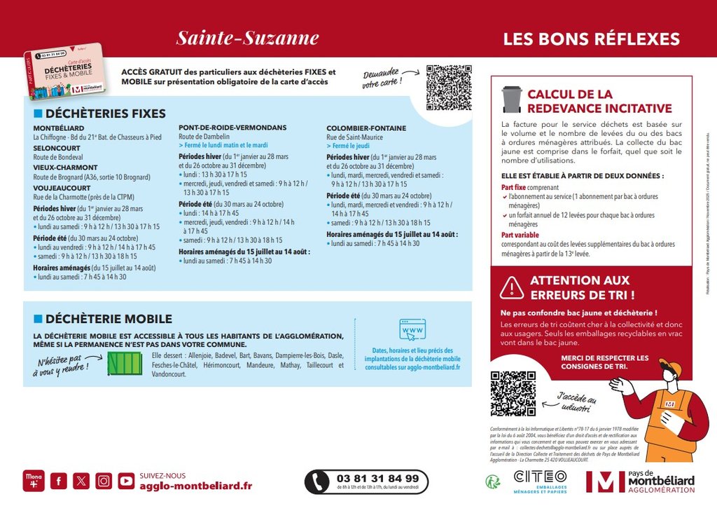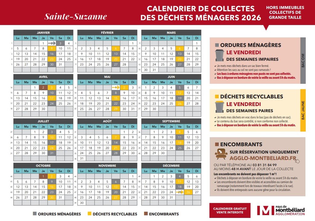 A noter les dates de la collecte des encombrants : jeudis 2 avril 2026 et 1 octobre 2026 sur réservation par téléphone au 03.81.31.84.99 via le formulaire en ligne https://www.agglo-montbeliard.fr/reservation-pour-la-collecte-des-encombrants/rendez-vous?tx_cimbookingslots_managereservation%5BabstractEntity%5D=62&tx_cimbookingslots_managereservation%5Baction%5D=show&tx_cimbookingslots_managereservation%5Bcontroller%5D=SlotsEntity&cHash=62fd3e006f3bc4c83a50237f43a411aa