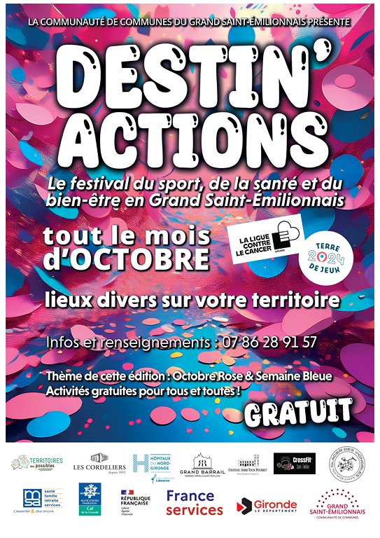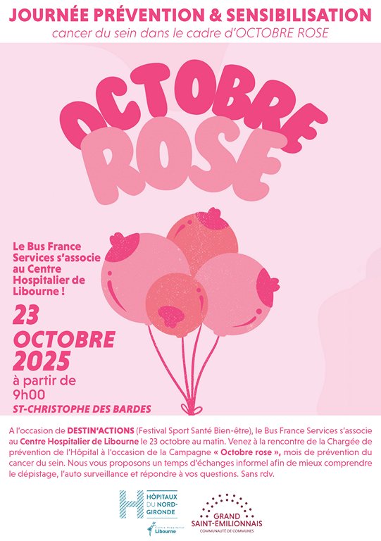 Dans le cadre de Destin’Actions 💫, et en partenariat avec l’hôpital de Libourne 🏥, nous organisons Jeudi 23 Octobre 📅 à Saint-Christophe des Bardes une Sensibilisation à la prévention du Cancer du Sein 🎗️.