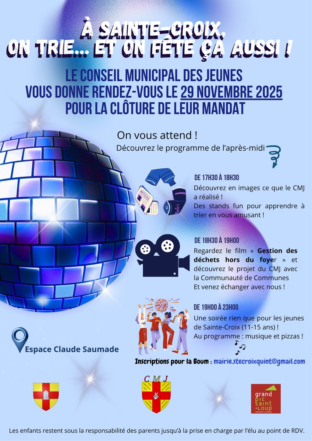 Le Conseil Municipal des Jeunes invite les jeunes de 11 Ă 15 ans de Sainte-Croix Ă une soirĂ©e exceptionnelle pour fĂȘter la fin de leur mandat !