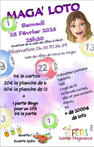Hello, Bon nous n'avons plus de salle des fêtes à Sainte Magnance pour le moment...Mais comme rien n'arrête le Comité Fêtes Ste Magnance et grâce à la Mairie de Cussy les Forges, nous vous organisons le samedi 28 février 2026 à partir de 19h30, un Maga Loto, avec plus de 2000 euros de lots à gagner !