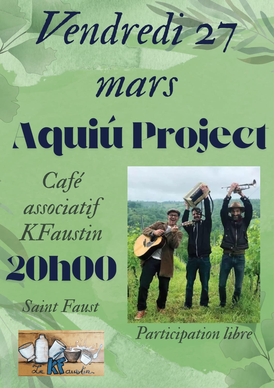 🎶🎼🎺🪗 Concert d' Aquiú Project. Vendredi 27 Mars au KFaustin. Café associatif de Saint Faust.🎵🎸🪘🌿