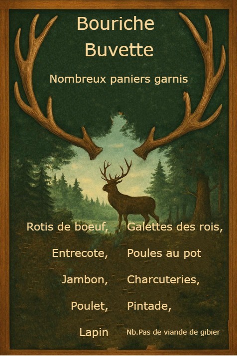 Bons d'achats : 20€, 30€, 50€, 150€, panier garnis, rôtis de bœuf, entrecôtes, jambon, poulets, lapin, pintades, poule au pot, charcuterie, galette des rois