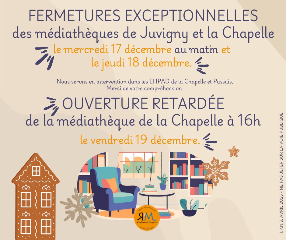 Les médiathèques de la Chapelle et Juvigny seront fermées toute la matinée du 𝗺𝗲𝗿𝗰𝗿𝗲𝗱𝗶 𝟭𝟳 𝗱é𝗰𝗲𝗺𝗯𝗿𝗲 car nous intervenons en EHPAD. Elles seront fermées également 𝗹𝗲 𝗷𝗲𝘂𝗱𝗶 𝟭𝟴 𝗱é𝗰𝗲𝗺𝗯𝗿𝗲.