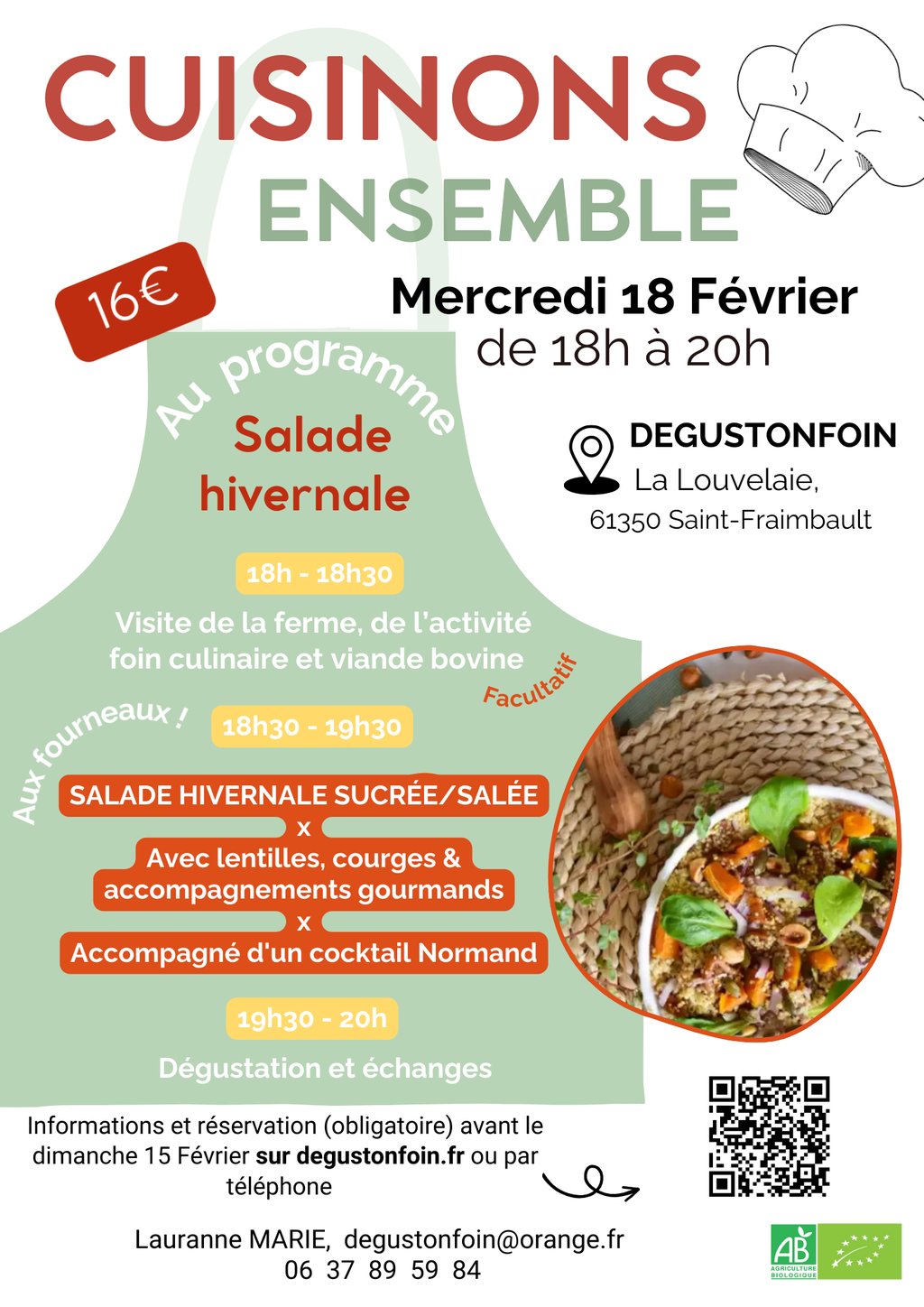 Le mercredi 18 février, venez vivre une expérience culinaire authentique en plein cœur de notre bocage ! Un moment de partage unique en totale immersion dans la ferme, pour cuisiner ensemble nos produits et ceux de notre terroir. Nos ateliers sont accessibles à tous, quelque soit votre niveau !