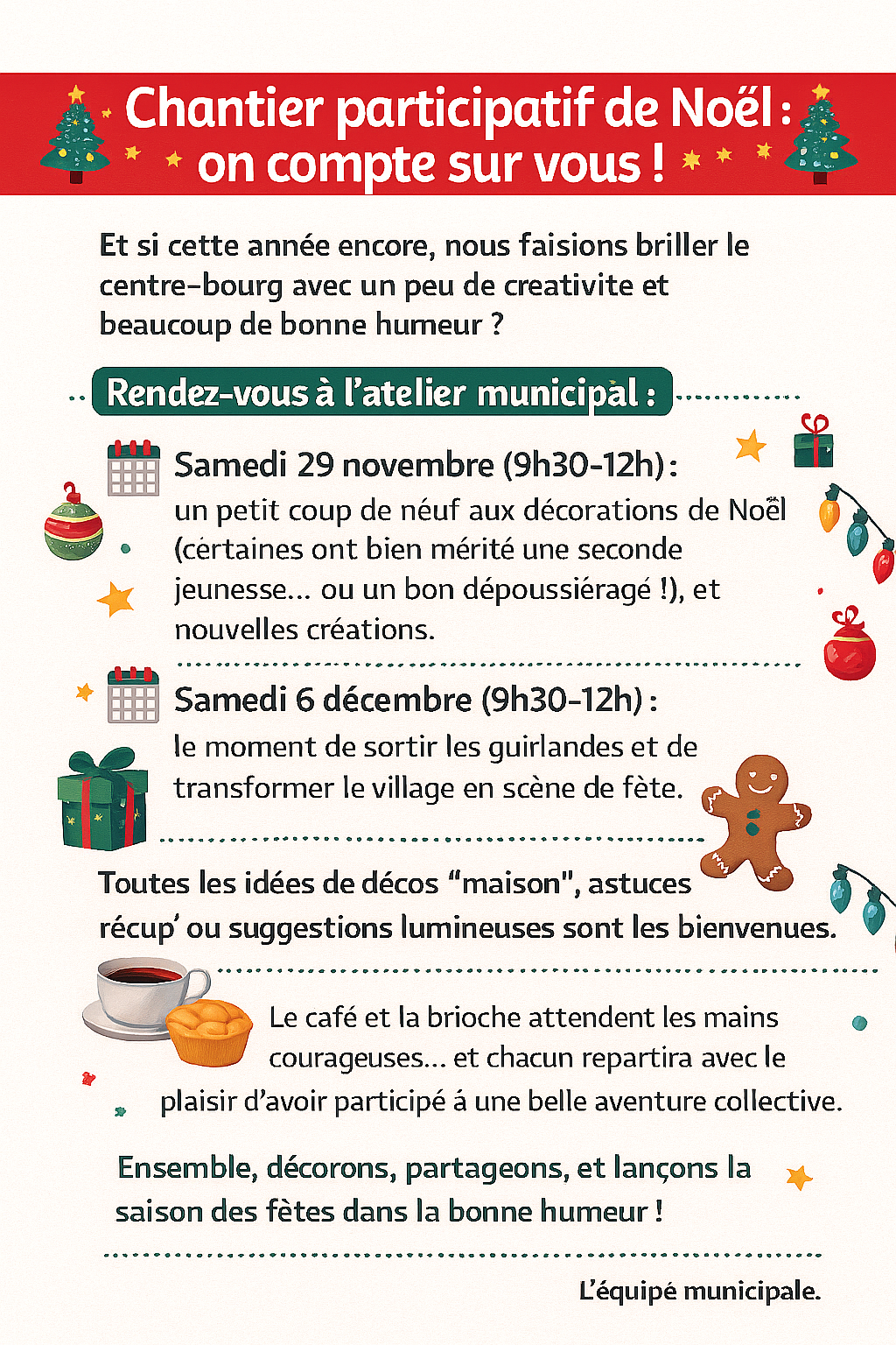 • Samedi 6 décembre (9h30-12h) : le moment de sortir les guirlandes et de transformer le village en scène de fête.