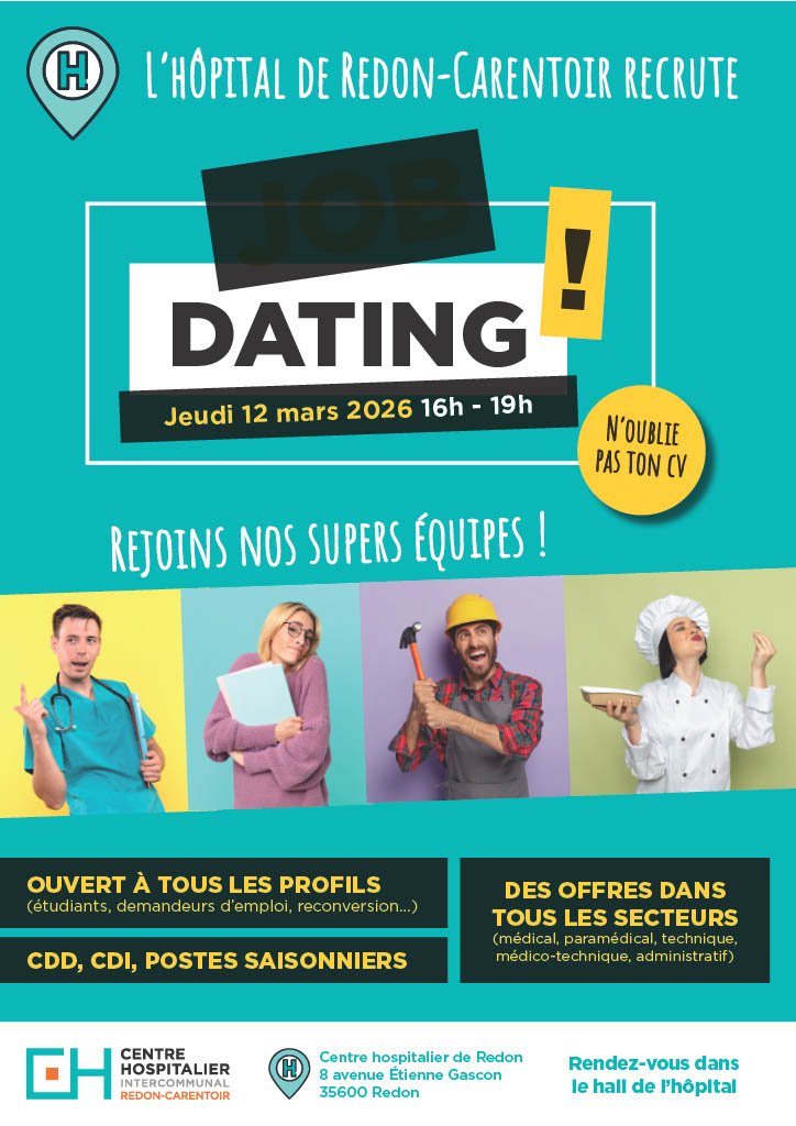 Le Centre Hospitalier de Redon-Carentoir organise un Job Dating le jeudi 12 mars 2026 de 16h à 19h, sur son site de Redon.