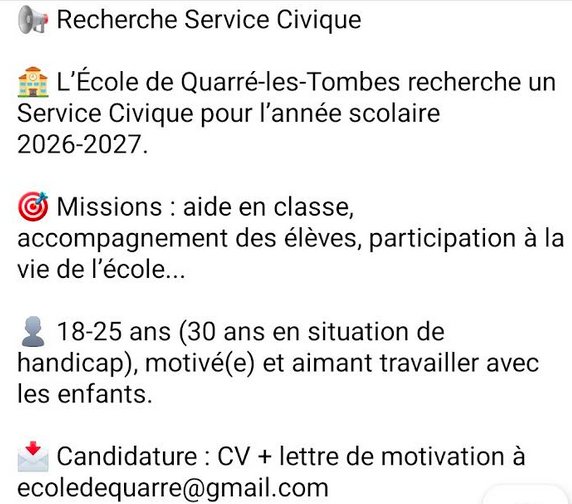 L'école de Quarré les Tombes recherche un service civique pour la rentrée prochaine.