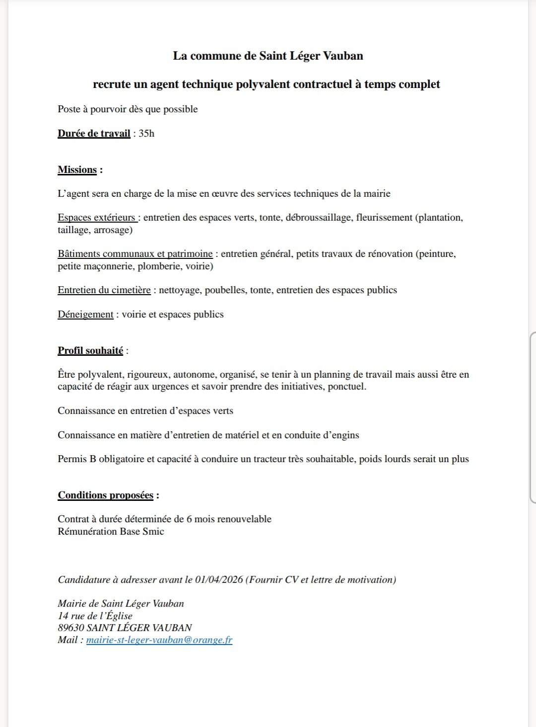 LA COMMUNE DE ST LÉGER VAUBAN RECRUTE UN AGENT COMMUNAL