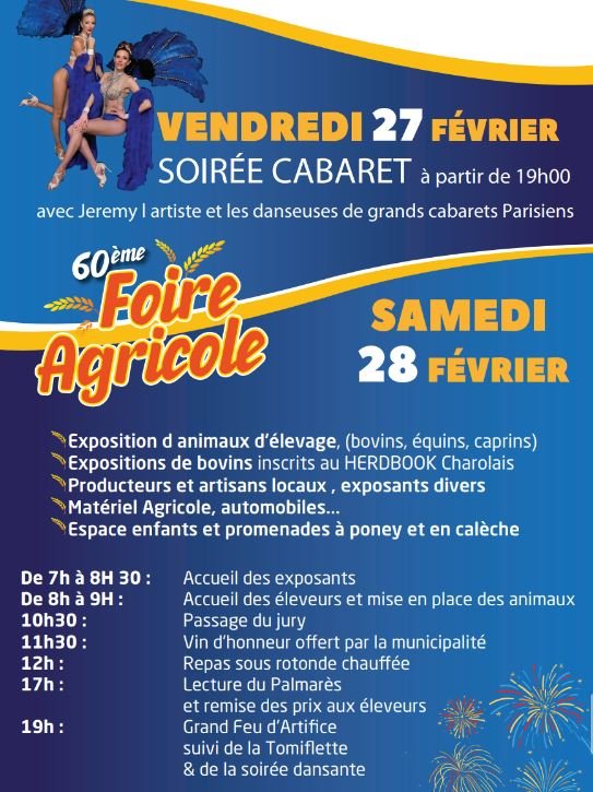 La foire agricole de Saint-Léger-Vauban se déroulera, cette année, sur 2 jours, à l'occasion de la 60ème ! Le vendredi 27 et le samedi 28 février 2026.