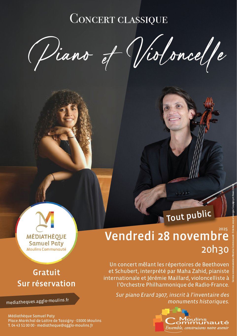 Concert classique Piano et Violoncelle, par Maha Zahid et Jérémie Maillard, mêlant les répertoires de Beethoven et Schubert pour une soirée entre contraste et légèreté.