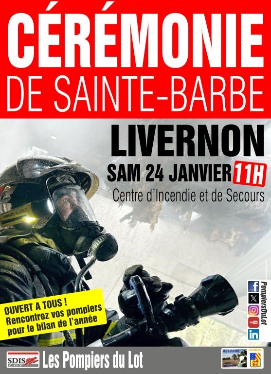 Cérémonie de Sainte-Barbe qui se déroulera Samedi 24 janvier, à 11h, au Centre de Secours de Livernon, ouvert à tous.