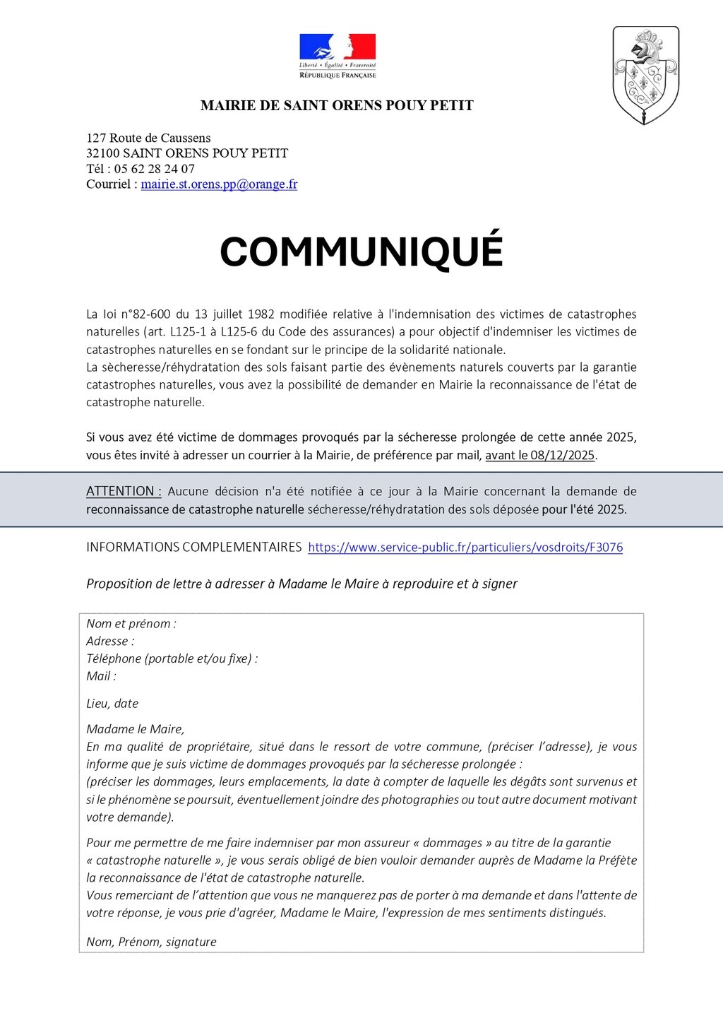 Afin de pouvoir si nécessaire déposer une demande de reconnaissance de catastrophe naturelle en janvier prochain pour notre commune, merci de nous faire part de vos difficultés comme indiqué dans ce communiqué svp.